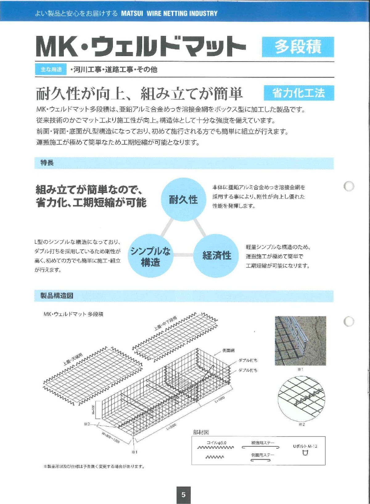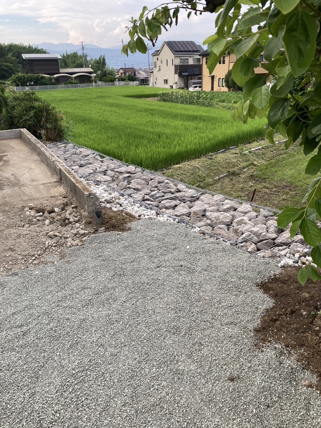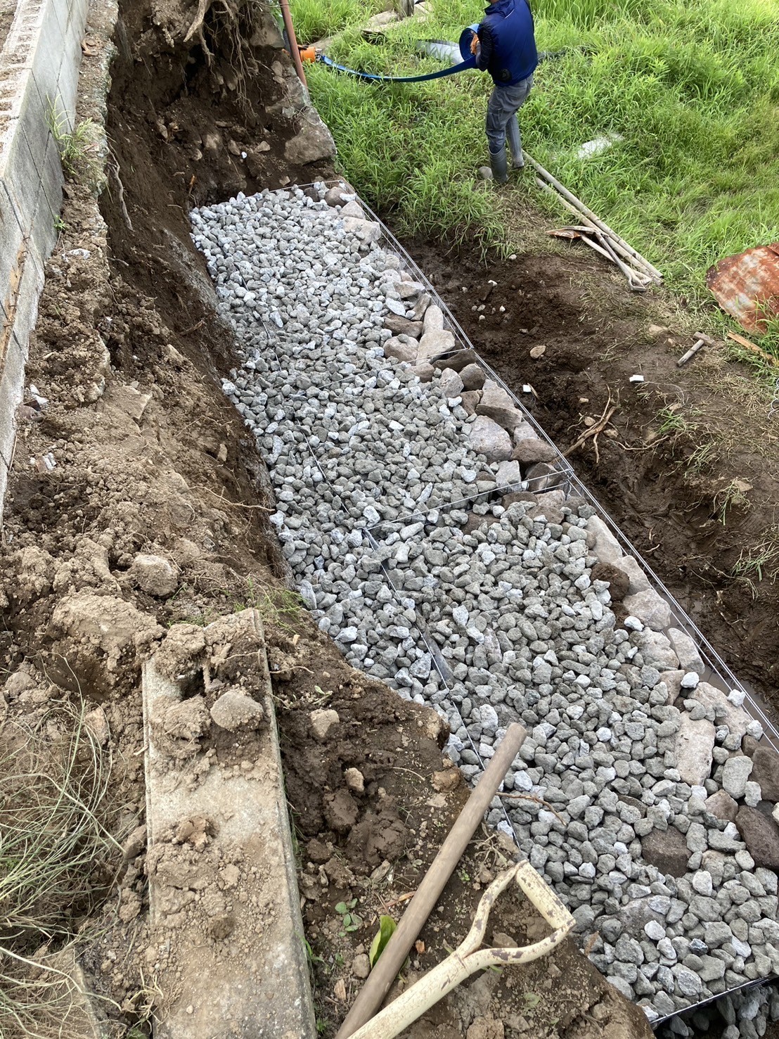ウェルドマットという籠状のものを使用し中に栗石を詰めて積み上げます。